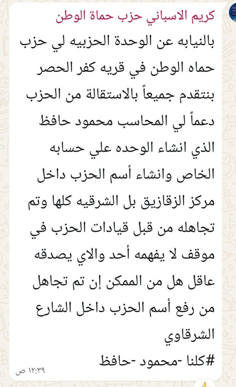 يشهد الشارع السياسي الشرقاوي الآن ، حالة من الغضب ، بسبب تقديم المحاسب محمود حافظ استقالته من حزب حماة الوطن ، كما يشهد الحزب تقديم استقالات جماعية ، على صفحات السوشيال ميديا والحروبات ، تعبيرا عن غضبهم من موقف حزب حماة الوطن ، مع مرشح الشباب محمود الأمين العام المساعد بالمحافظة ، ورئيس قطاع الدائرة الأولى بالشرقية .