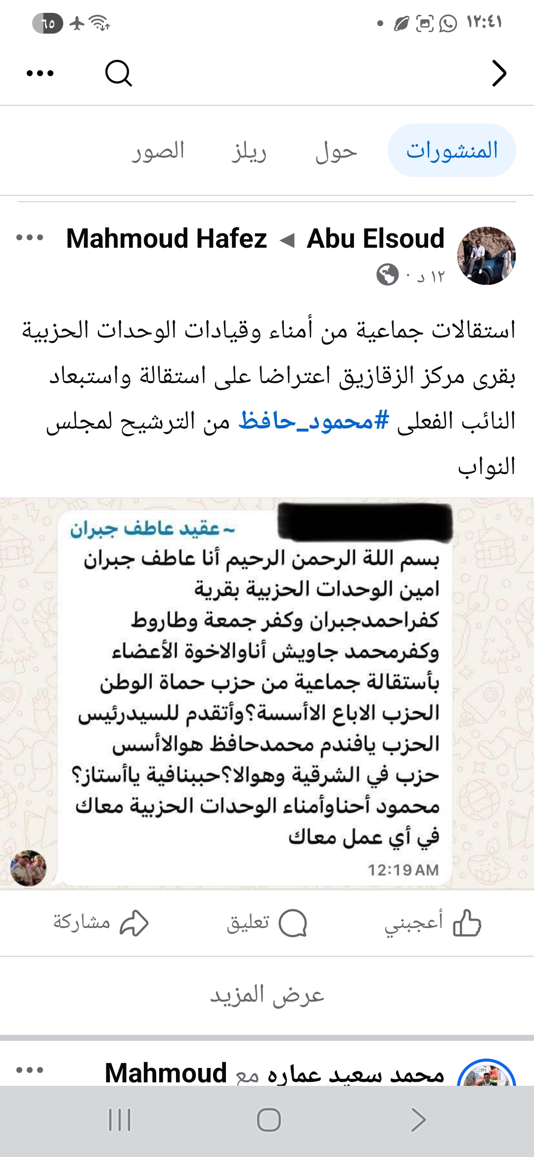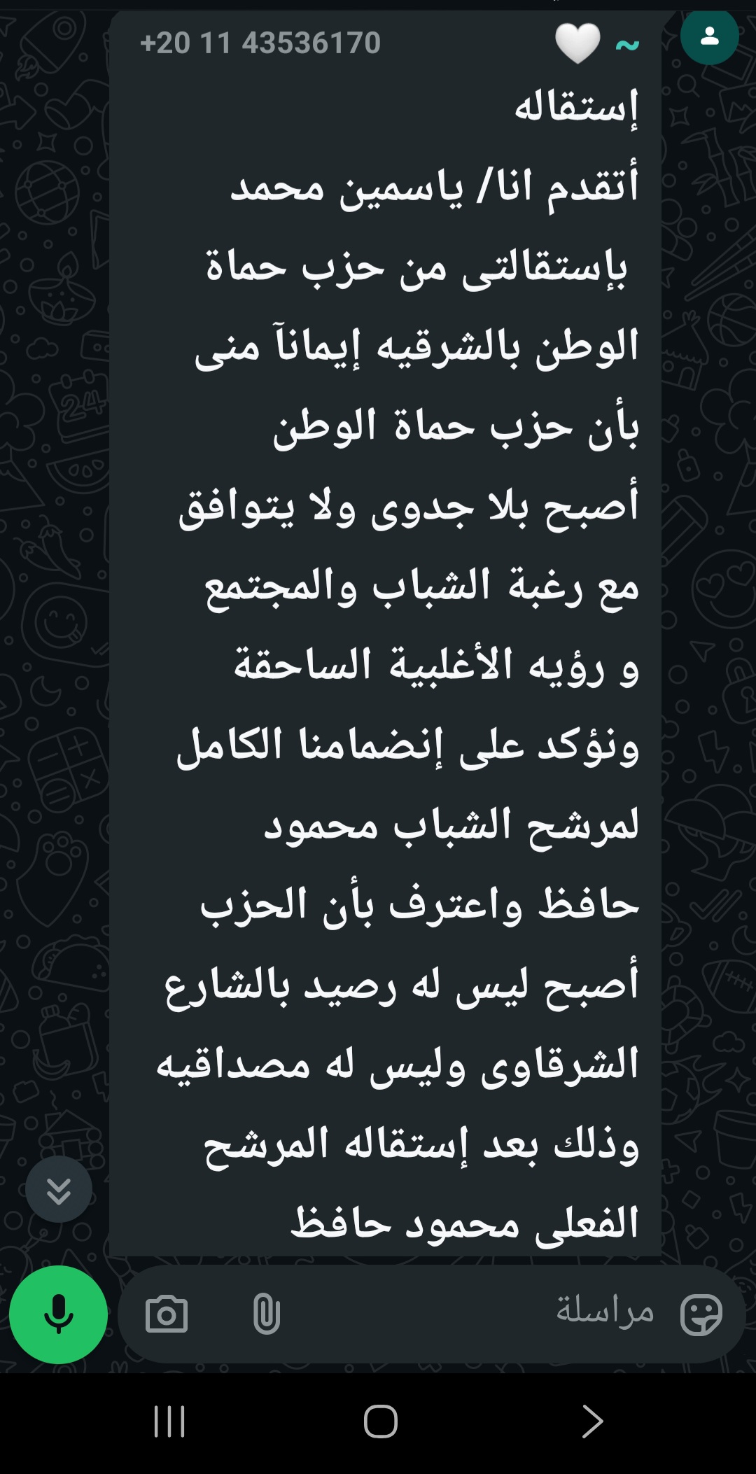 حيث أكد شباب الحزب الذين تقدموا باستقالاتهم ، أن محمود حافظ أحد الركائز الأساسية في أمانة الحزب بالمحافظة ، وداعم للحزب بشكل لم نشهده من غيره ، وقام باحتواء الشباب ودعمهم ، الامر الذي أدي لانتشار الوحدات الحزبية بالقرى، وفتح مقرات لها على نقته الشخصية .